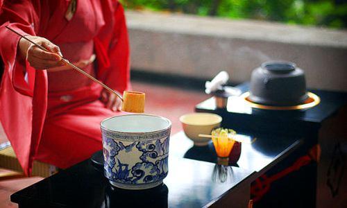 “和、敬、清、寂”是茶道的“四规”。“和”即“和谐”;敬,心灵单纯主客间互敬;清和寂则指饮茶的环境和氛围,需清静典雅。这是贯穿在茶道仪式中的精神。茶道中用的茶是抹茶,采茶前两周内不被阳光直射的新芽,经蒸茶、烘干、粉碎、干燥后再用石墨碾成粉末,成为抹茶。抹茶又分为浓茶与薄茶,浓茶是茶道中最郑重的一项仪式。主人必须穿黑色带白色纹饰的和服,茶道礼法前,客人观赏茶道用具、主人请客人用茶点心。礼法进行期间主任和客人几乎不进行对话。献茶时,客人右手扶茶碗置于左手心,轻轻转上两圈将碗上花纹图案对着献茶人并将碗举至额头表示还礼,分三次喝完为一般礼仪。喝完后用食指和拇指轻擦碗边,再将碗左旋两次放回膝前,并说些吉利的话来赞美茶具的精美、环境的典雅以及感谢主人的款待。茶道能够源远流长,是因为它在繁乱的人世之外营造了一个清静宁和的精神世界。